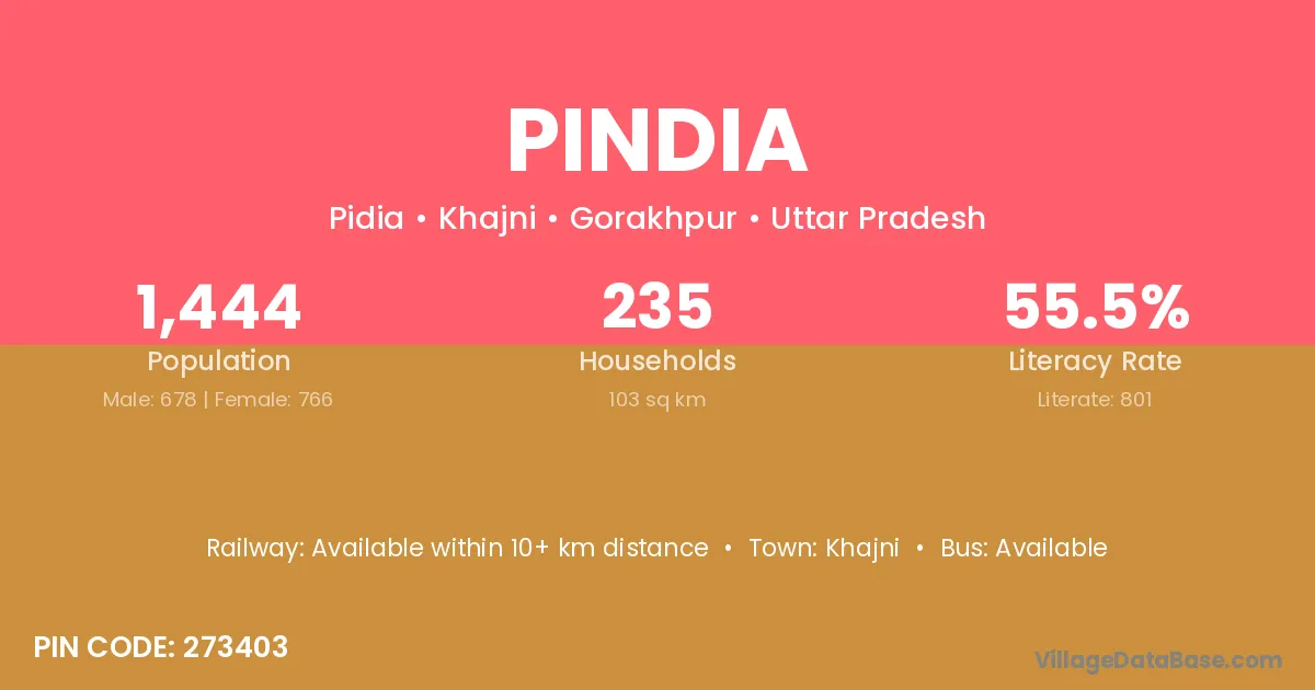 Pindia village has a total population of 1,444 people, of which 678 are males and 766 are females.