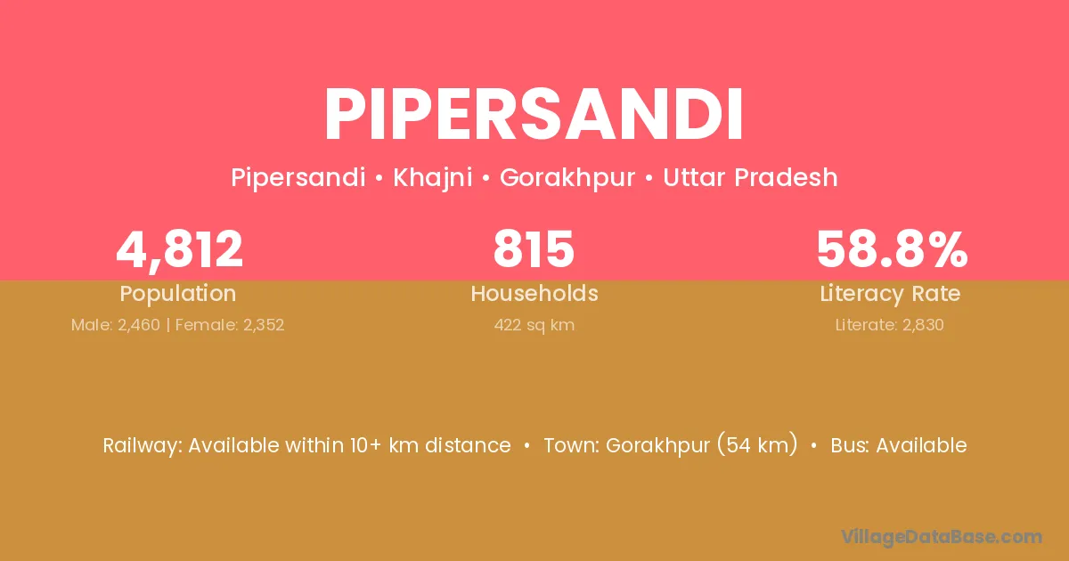 Gorakhpur (54 km) is the nearest town to Pipersandi village for major economic activities and is located approximately 54 km away.