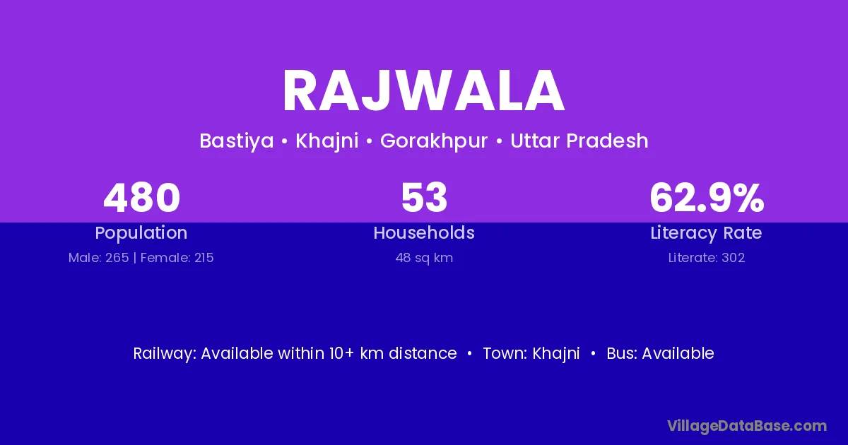Rajwala village has a total population of 480 people, of which 265 are males and 215 are females.