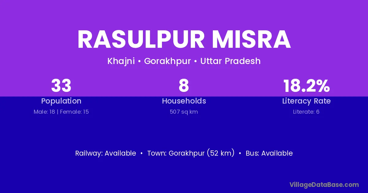Rasulpur Misra village has a total population of 33 people, of which 18 are males and 15 are females.