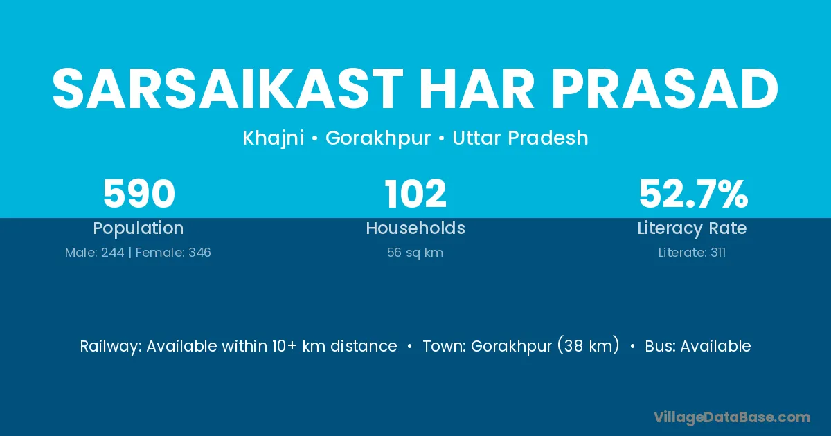 Gorakhpur (38 km) is the nearest town to Sarsaikast Har Prasad village for major economic activities and is located approximately 38 km away.