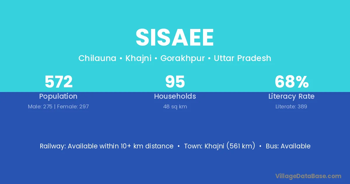 Khajni (561 km) is the nearest town to Sisaee village for major economic activities and is located approximately 561 km away.