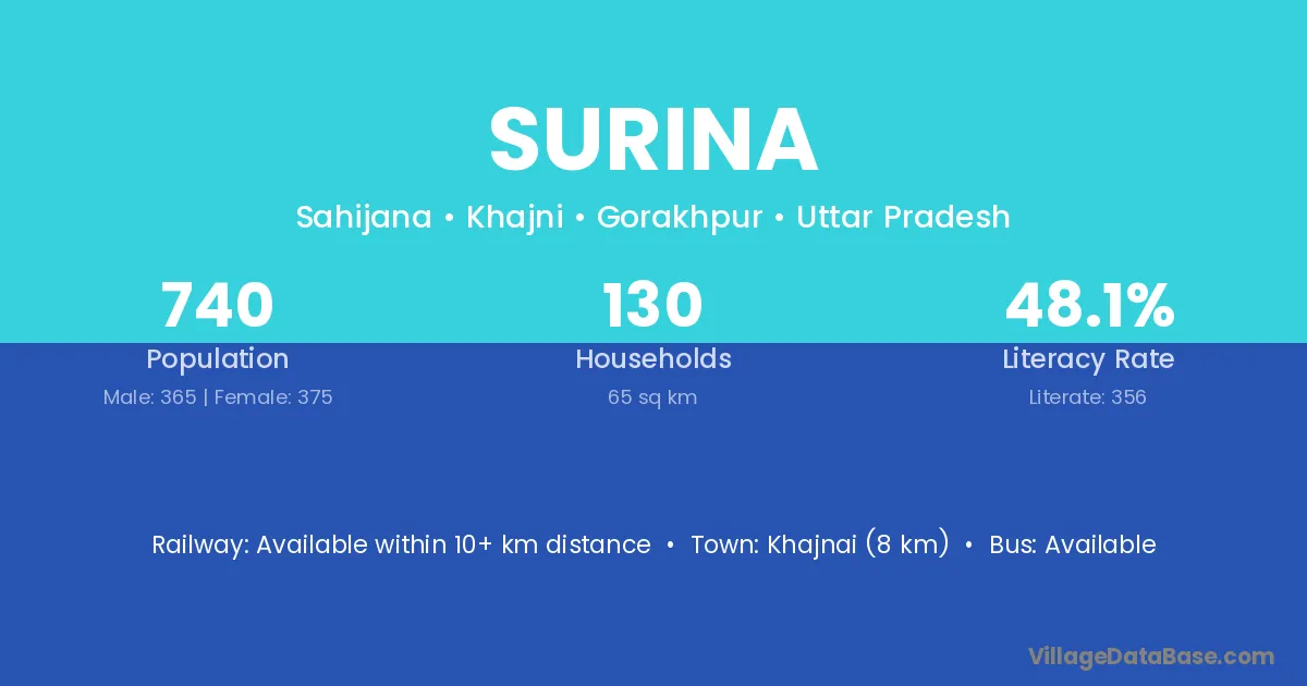 Surina village has a total population of 740 people, of which 365 are males and 375 are females.