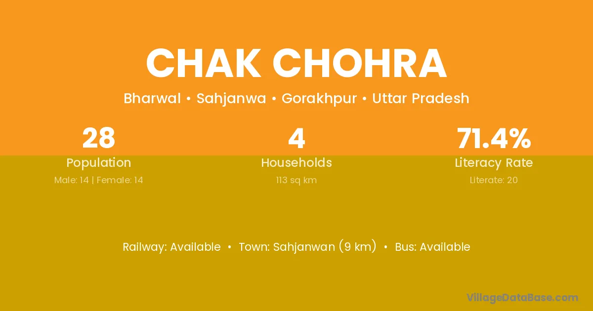 Chak Chohra village has a total population of 28 people, of which 14 are males and 14 are females.