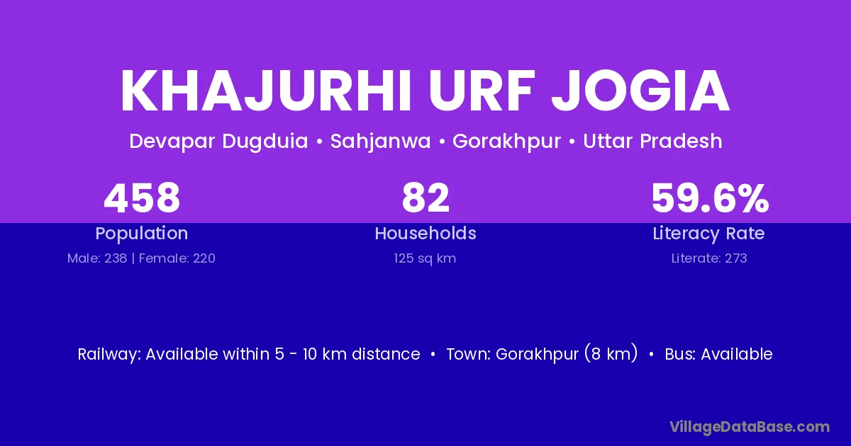 Khajurhi Urf Jogia village has a total population of 458 people, of which 238 are males and 220 are females.