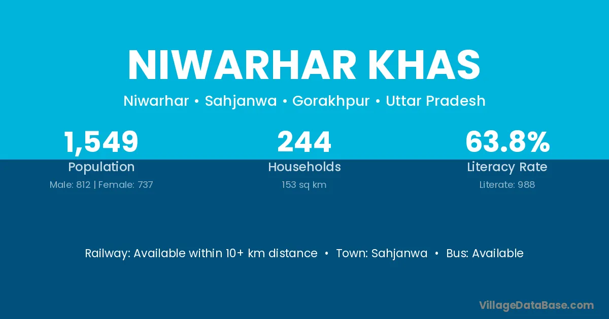 Niwarhar Khas village has a total population of 1,549 people, of which 812 are males and 737 are females.