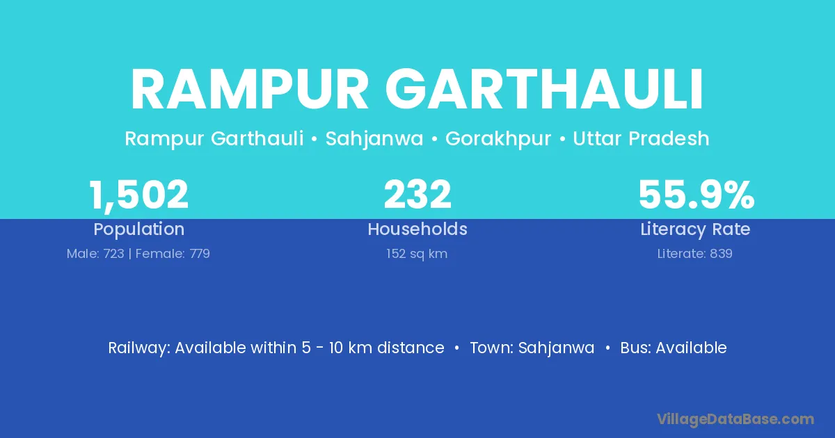 Rampur Garthauli village has a total population of 1,502 people, of which 723 are males and 779 are females.