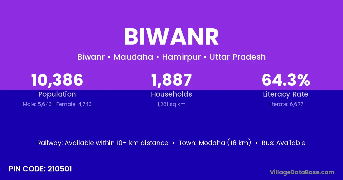 Biwanr village has a total population of 10,386 people, of which 5,643 are males and 4,743 are females.