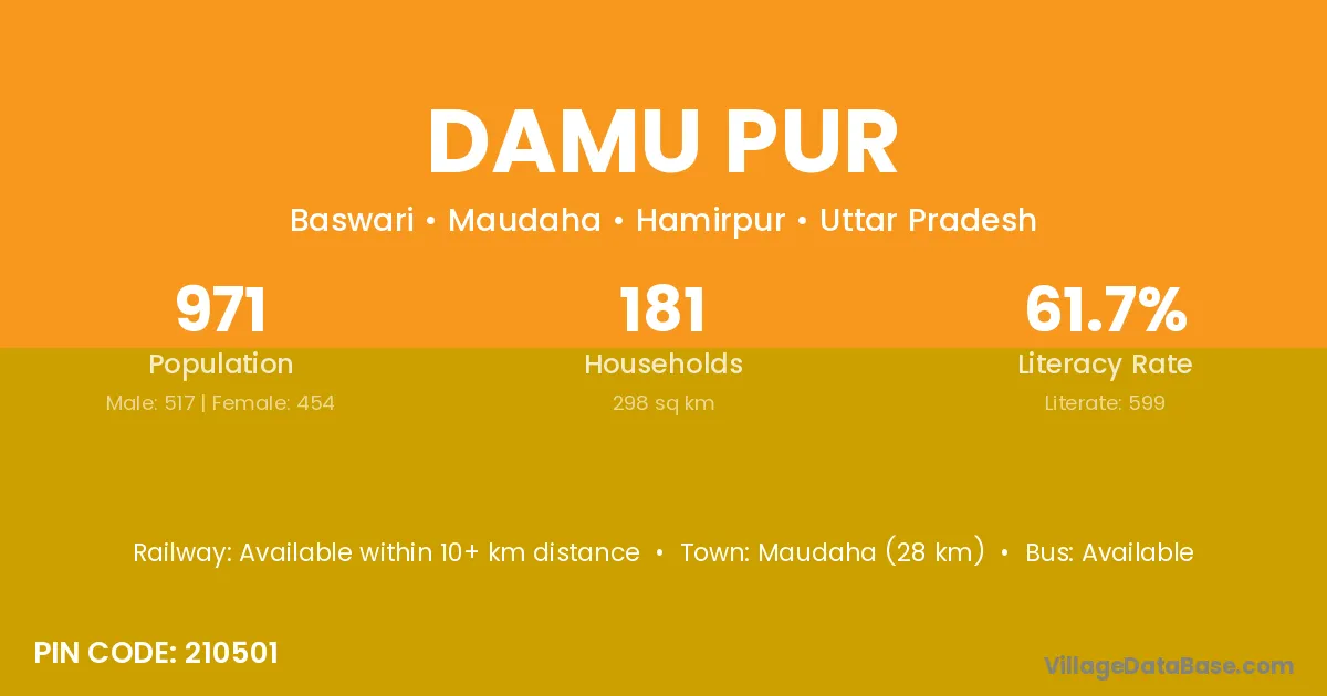 Maudaha (28 km) is the nearest town to Damu Pur village for major economic activities and is located approximately 28 km away.