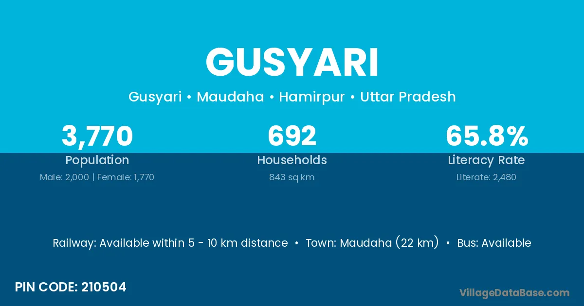 Maudaha (22 km) is the nearest town to Gusyari village for major economic activities and is located approximately 22 km away.