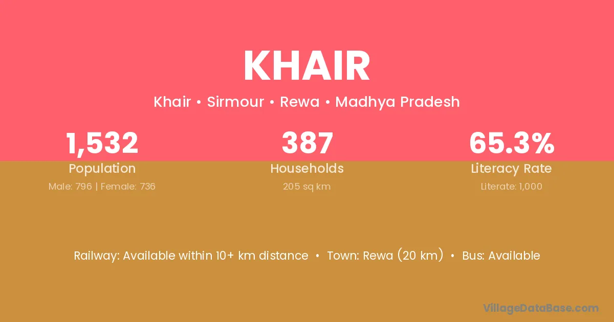 The literacy rate of Khair village is 52.88%. Male literacy stands at 62.43% and female literacy at 42.08%.