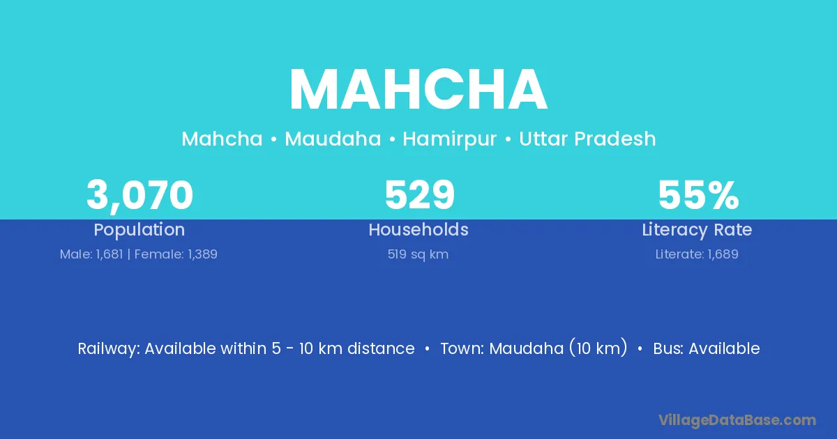 Maudaha (10 km) is the nearest town to Mahcha village for major economic activities and is located approximately 10 km away.