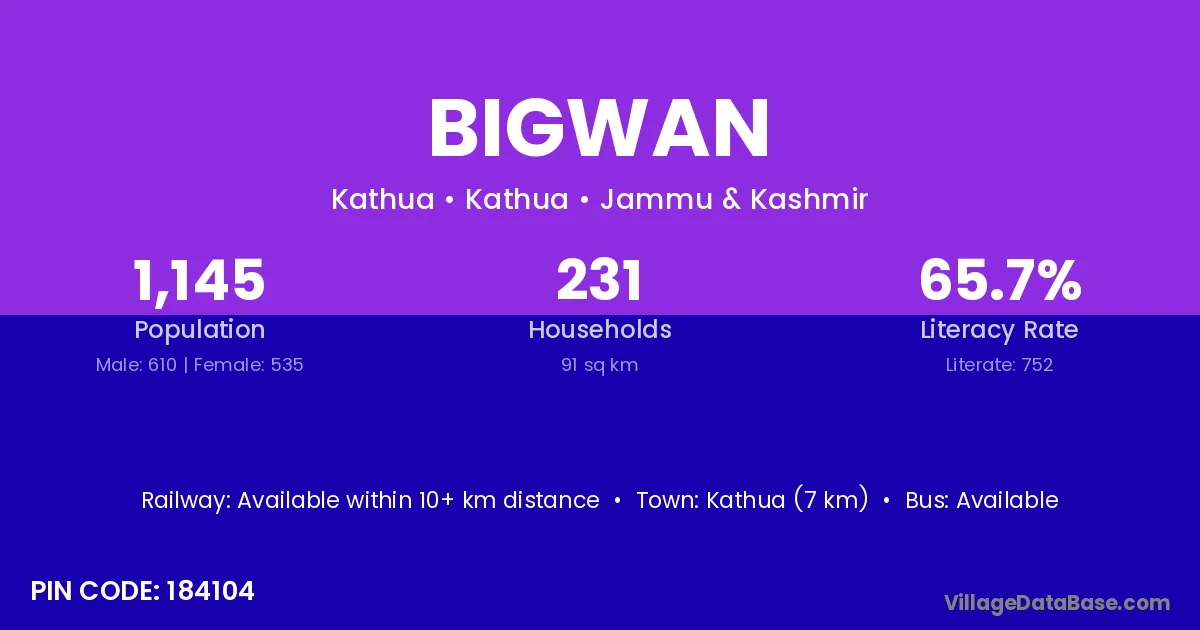 The literacy rate of Bigwan village is 64.53%. Male literacy stands at 77.29% and female literacy at 50.21%.