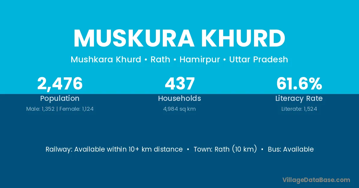 Muskura Khurd village has a total population of 2,476 people, of which 1,352 are males and 1,124 are females.