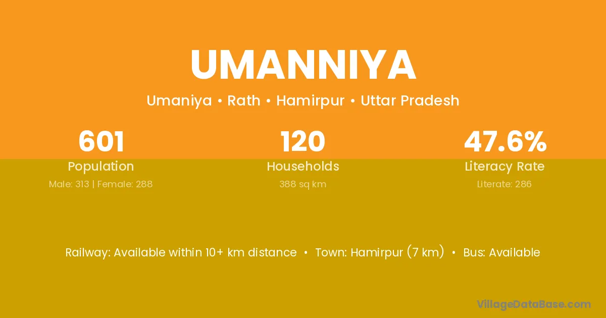 Hamirpur (7 km) is the nearest town to Umanniya village for major economic activities and is located approximately 7 km away.