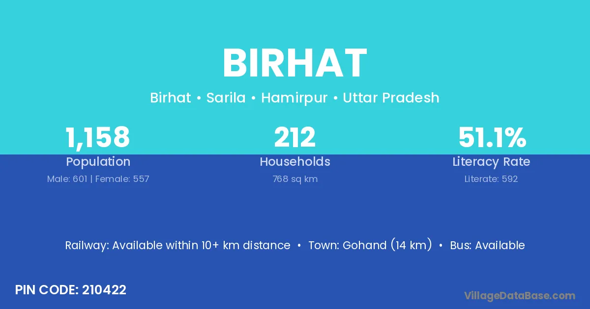 Birhat village has a total population of 1,158 people, of which 601 are males and 557 are females.