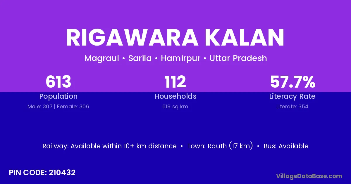 Rigawara Kalan village has a total population of 613 people, of which 307 are males and 306 are females.