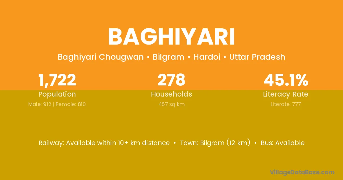 Bilgram (12 km) is the nearest town to Baghiyari village for major economic activities and is located approximately 12 km away.