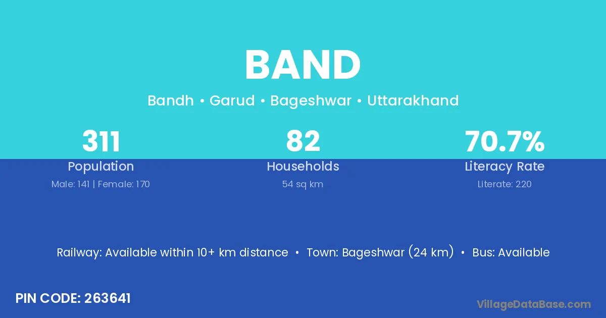 The literacy rate of Band village is 37.32%. Male literacy stands at 44.13% and female literacy at 28.83%.