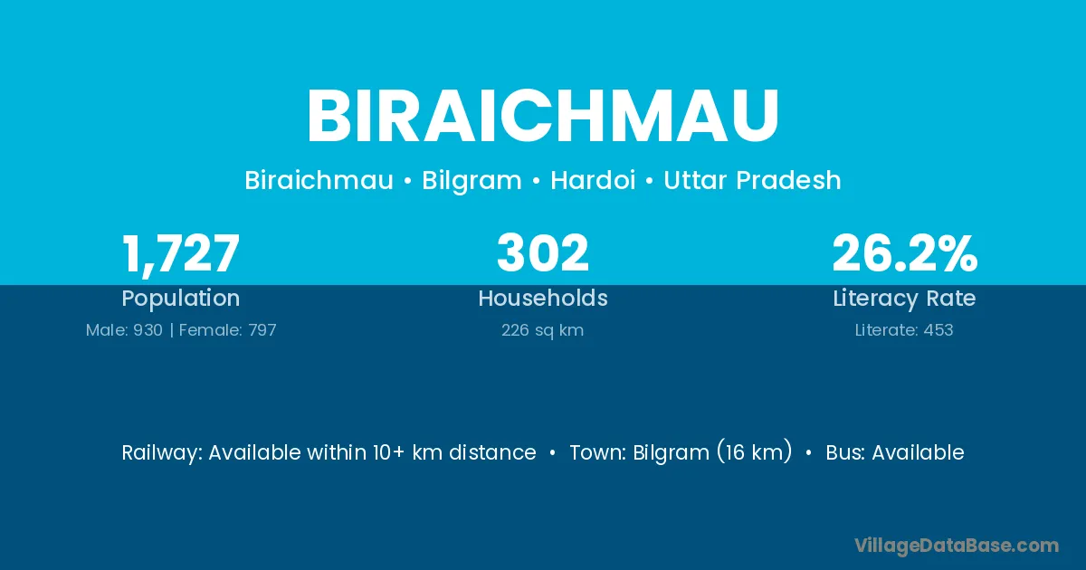 Bilgram (16 km) is the nearest town to Biraichmau village for major economic activities and is located approximately 16 km away.