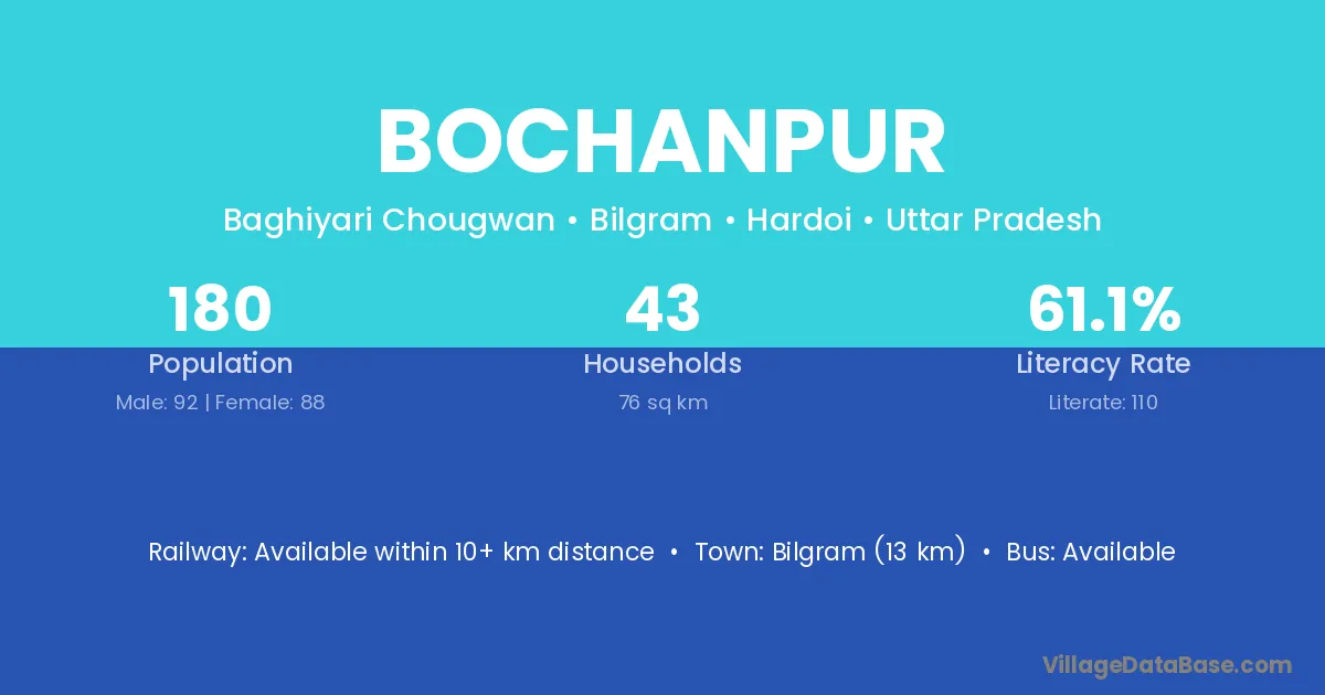 Bilgram (13 km) is the nearest town to Bochanpur village for major economic activities and is located approximately 13 km away.