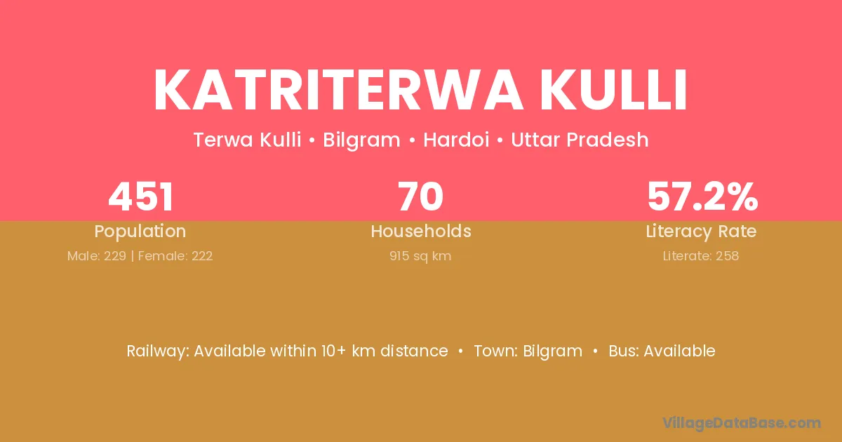 Katriterwa Kulli village has a total population of 451 people, of which 229 are males and 222 are females.