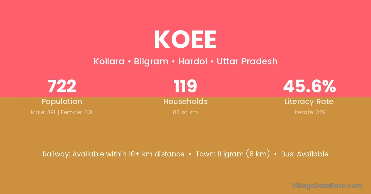 Bilgram (6 km) is the nearest town to Koee village for major economic activities and is located approximately 6 km away.