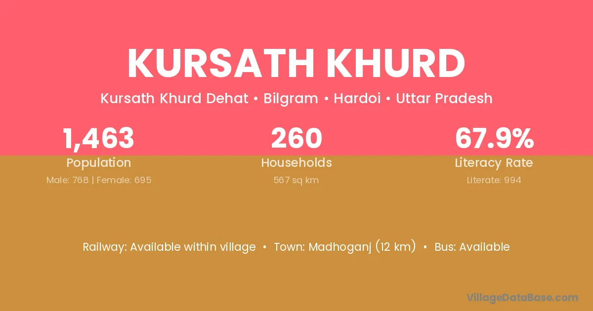 Kursath Khurd village has a total population of 1,463 people, of which 768 are males and 695 are females.