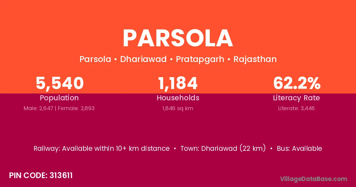 The literacy rate of Parsola village is 64.32%. Male literacy stands at 70.49% and female literacy at 57.35%.