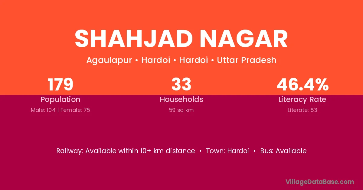 Shahjad Nagar village has a total population of 179 people, of which 104 are males and 75 are females.