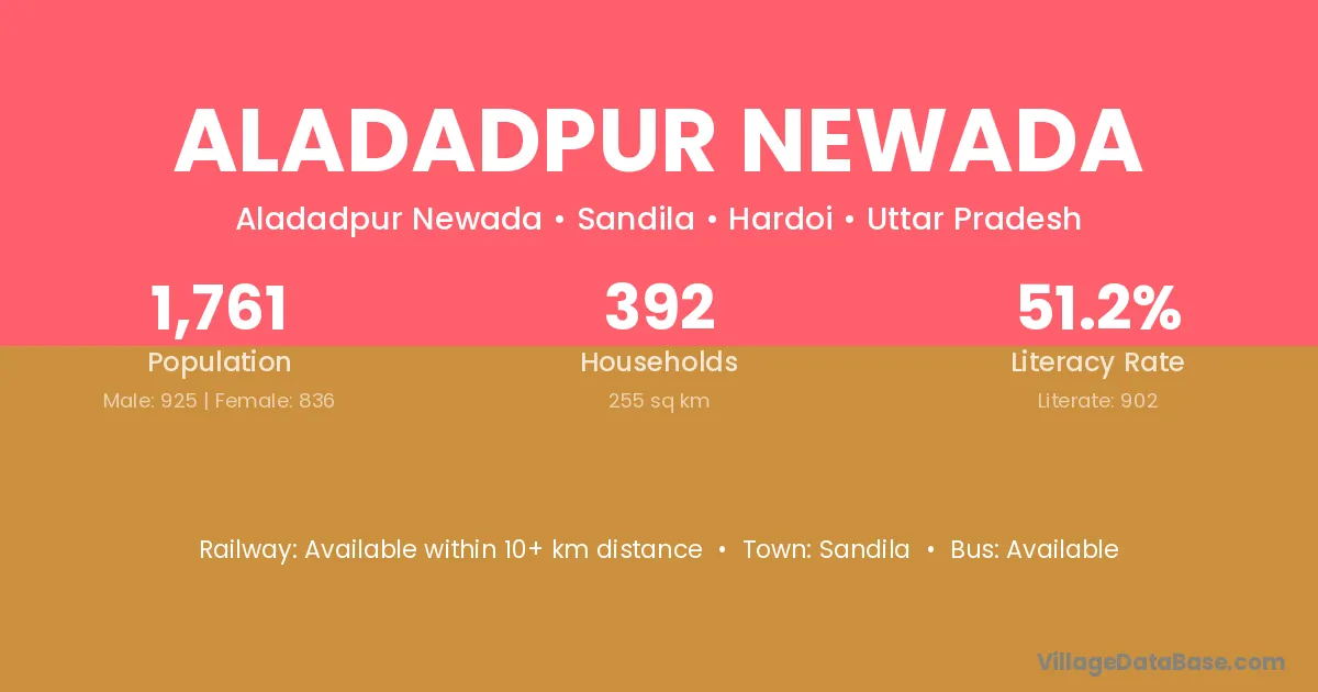 Aladadpur Newada village has a total population of 1,761 people, of which 925 are males and 836 are females.