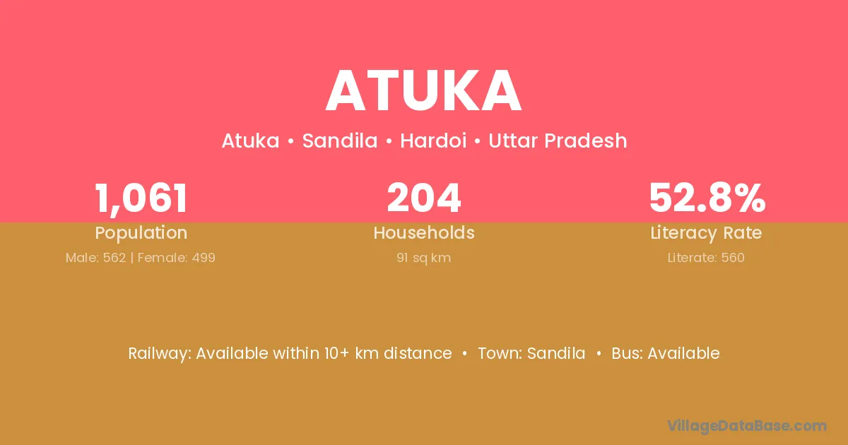 The literacy rate of Atuka village is 52.78%. Male literacy stands at 66.37% and female literacy at 37.47%.