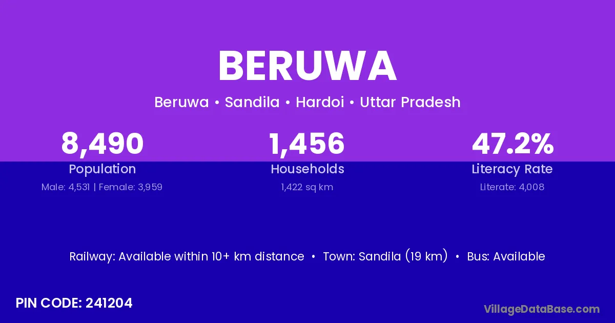 Sandila (19 km) is the nearest town to Beruwa village for major economic activities and is located approximately 19 km away.