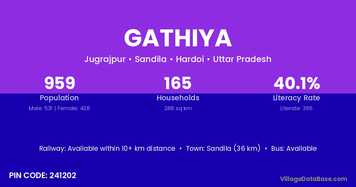 Sandila (36 km) is the nearest town to Gathiya village for major economic activities and is located approximately 36 km away.