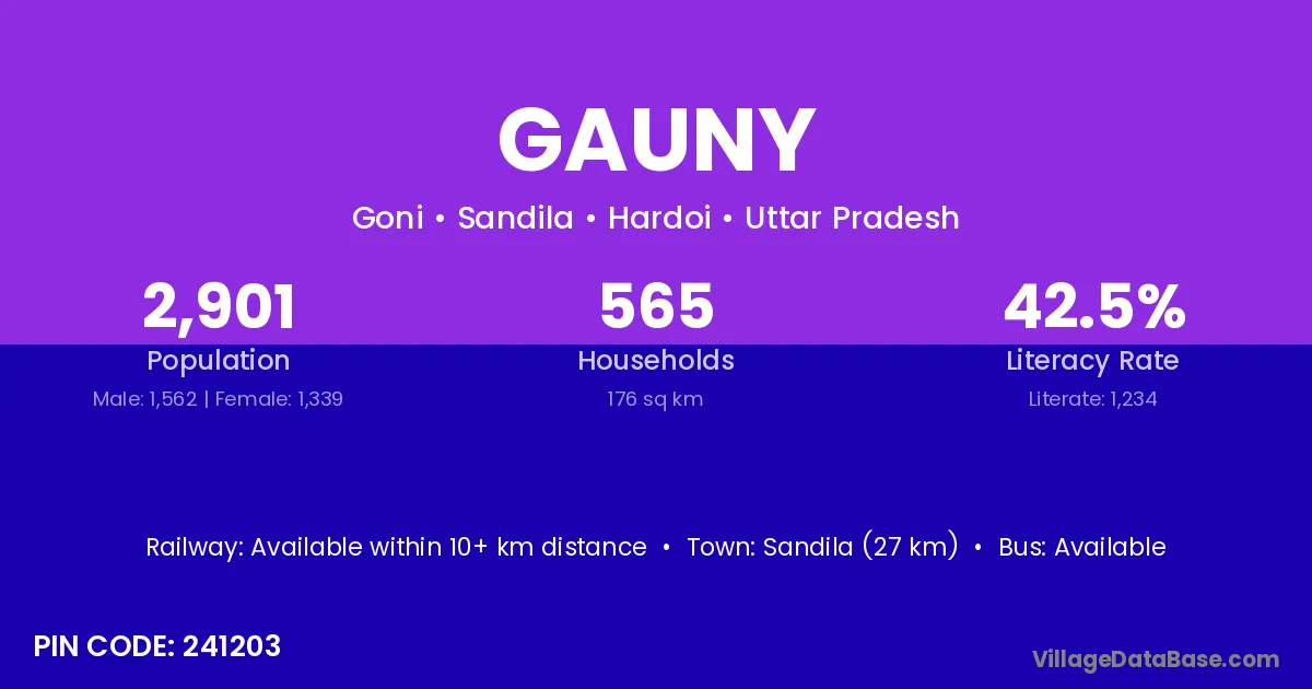 Sandila (27 km) is the nearest town to Gauny village for major economic activities and is located approximately 27 km away.