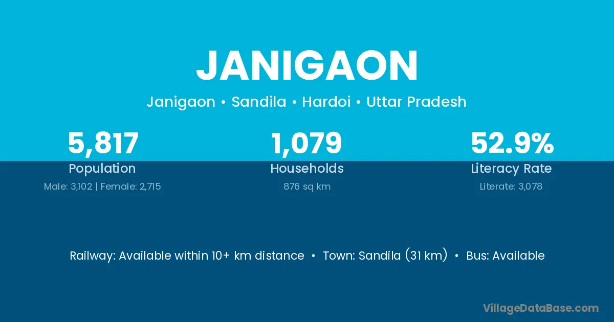 Sandila (31 km) is the nearest town to Janigaon village for major economic activities and is located approximately 31 km away.