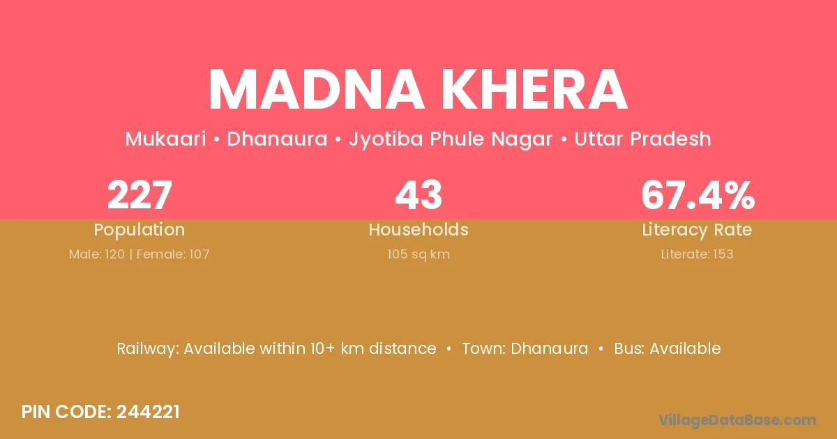 The literacy rate of Madna Khera village is 49.19%. Male literacy stands at 59.07% and female literacy at 38.20%.