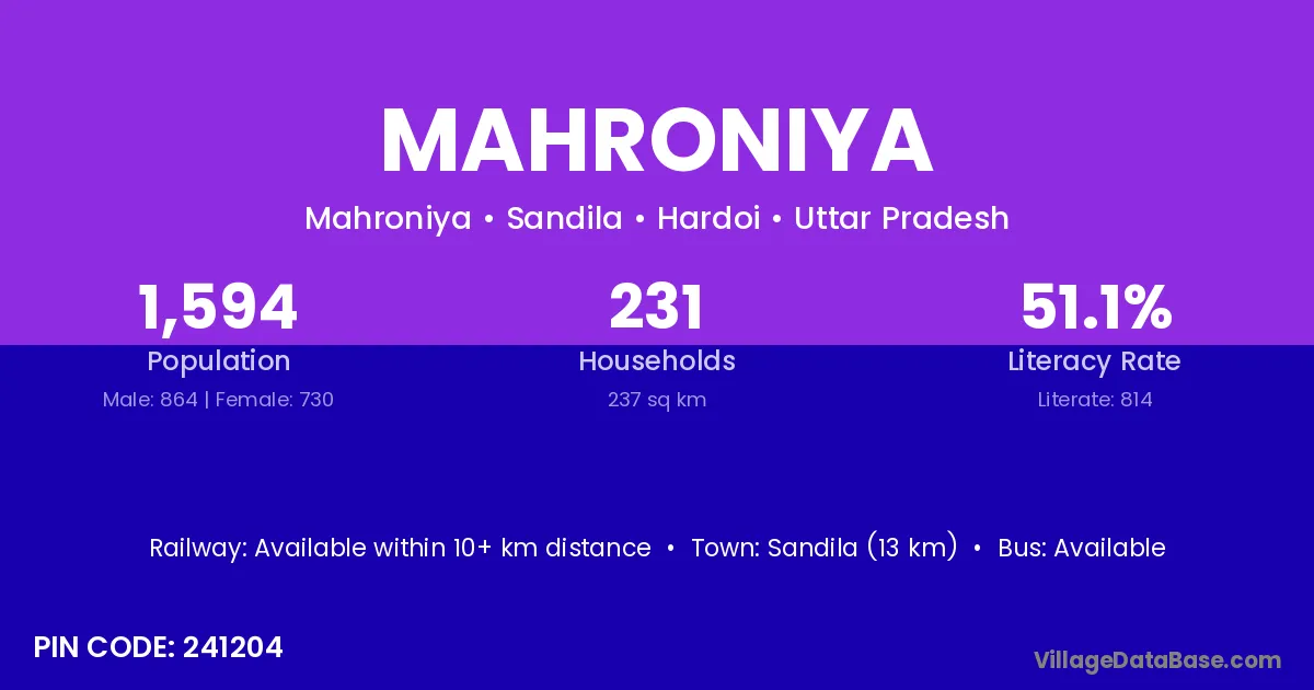 Sandila (13 km) is the nearest town to Mahroniya village for major economic activities and is located approximately 13 km away.