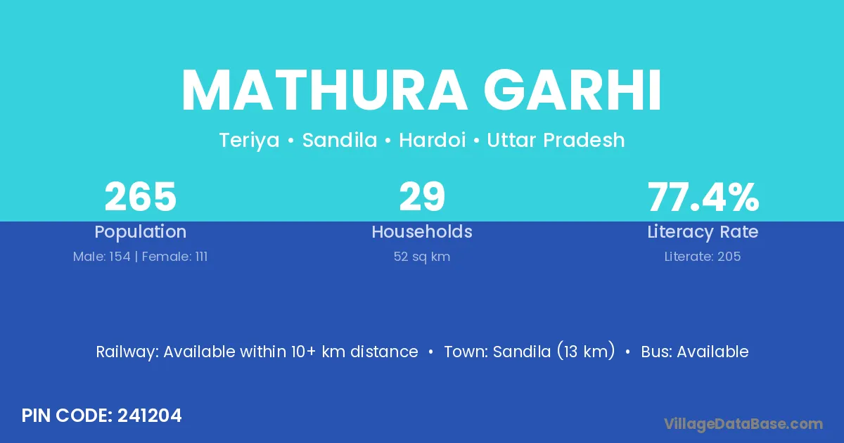 Sandila (13 km) is the nearest town to Mathura Garhi village for major economic activities and is located approximately 13 km away.