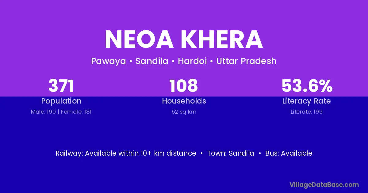Neoa Khera village has a total population of 371 people, of which 190 are males and 181 are females.
