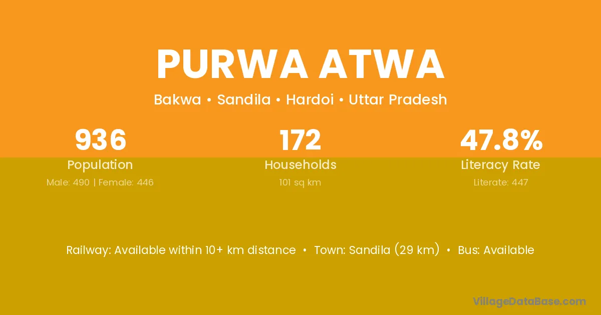 Sandila (29 km) is the nearest town to Purwa Atwa village for major economic activities and is located approximately 29 km away.