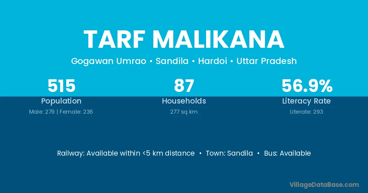 Tarf Malikana village has a total population of 515 people, of which 279 are males and 236 are females.