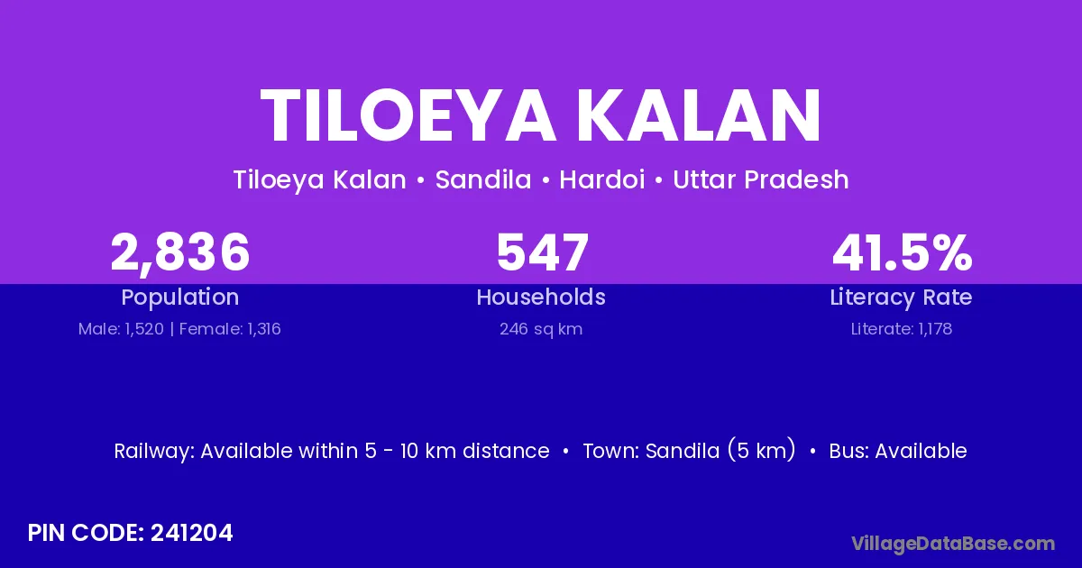 Sandila (5 km) is the nearest town to Tiloeya Kalan village for major economic activities and is located approximately 5 km away.