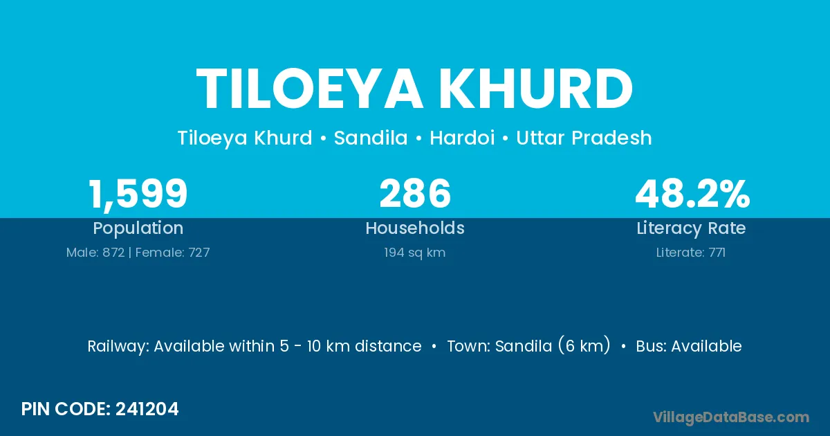 Sandila (6 km) is the nearest town to Tiloeya Khurd village for major economic activities and is located approximately 6 km away.