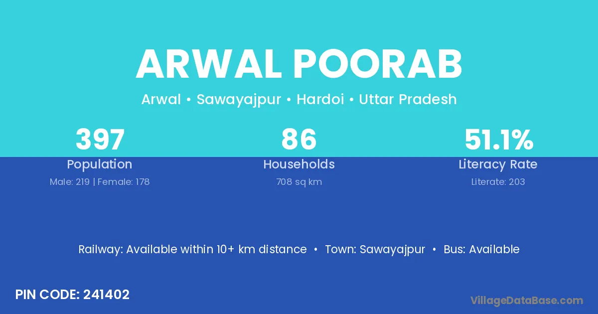 According to Census 2011 information, the village code of Arwal Poorab village is 241402.