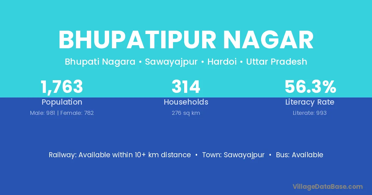 Bhupatipur Nagar village has a total population of 1,763 people, of which 981 are males and 782 are females.