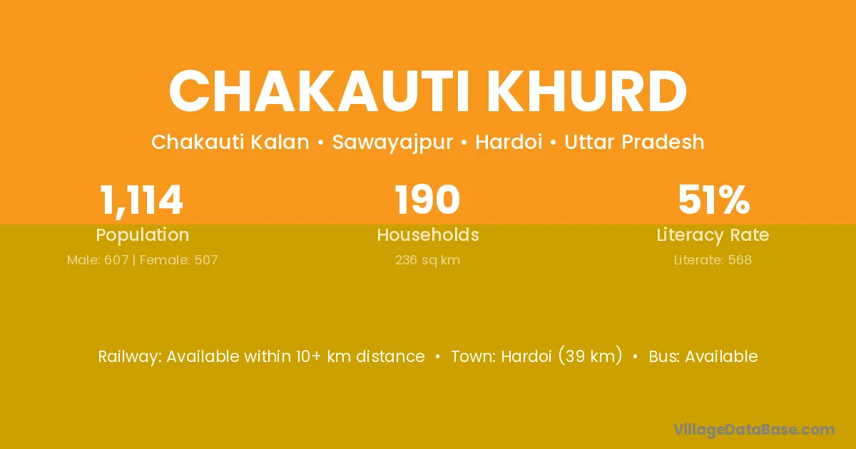 Hardoi (39 km) is the nearest town to Chakauti Khurd village for major economic activities and is located approximately 39 km away.