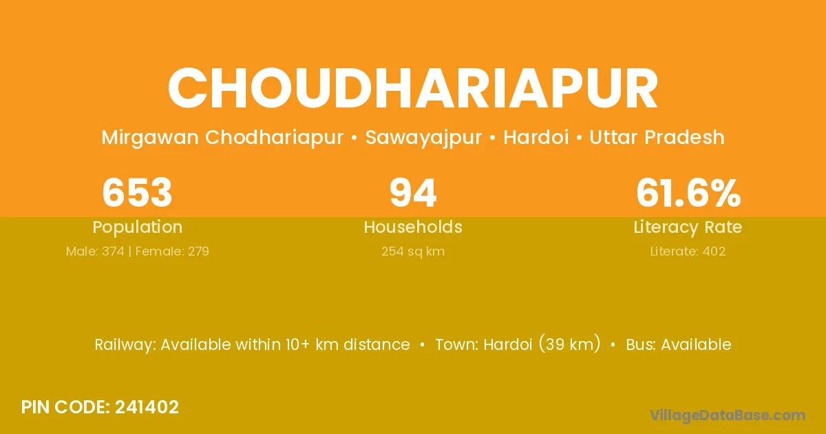 Hardoi (39 km) is the nearest town to Choudhariapur village for major economic activities and is located approximately 39 km away.