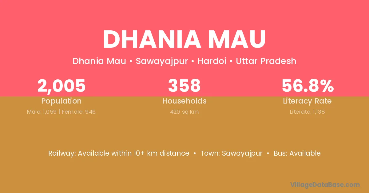 Dhania Mau village has a total population of 2,005 people, of which 1,059 are males and 946 are females.