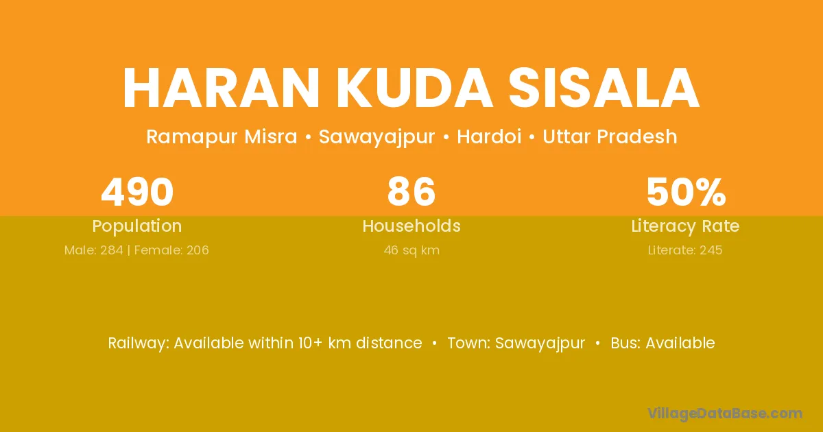 Haran Kuda Sisala village has a total population of 490 people, of which 284 are males and 206 are females.